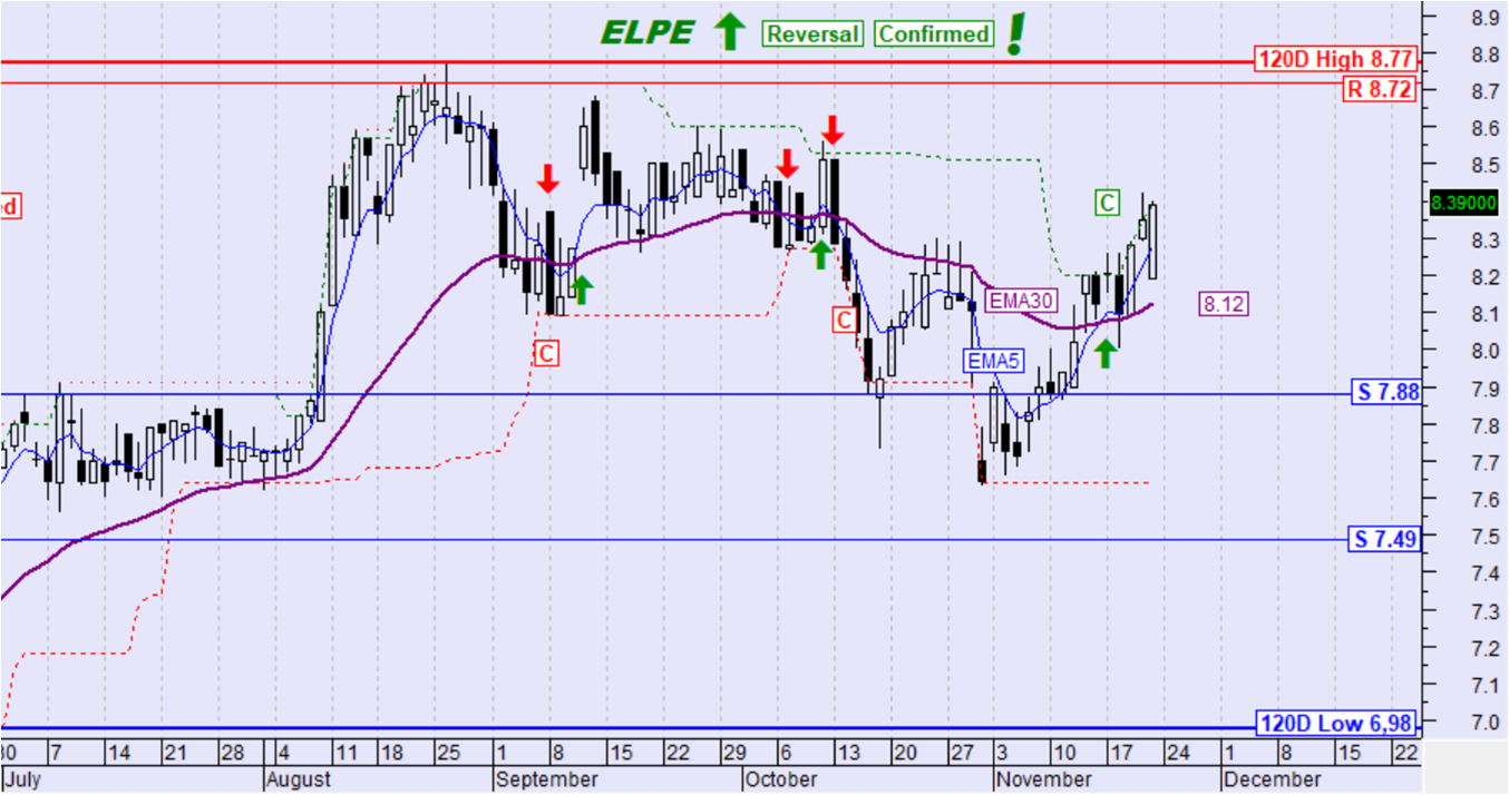 Η μετοχή την περασμένη εβδομάδα κινήθηκε ανοδικά. Ο ΕΜΑ5 πέρασε ψηλότερα του ΕΜΑ30 με αποτέλεσμα τη σηματοδότηση αντιστροφής της μεσοπρόθεσμης τάσης σε ανοδική η οποία ταυτόχρονα επιβεβαιώθηκε με υπέρβαση του ορίου επιβεβαίωσης της αντιστροφής της τάσης σε ανοδική.
