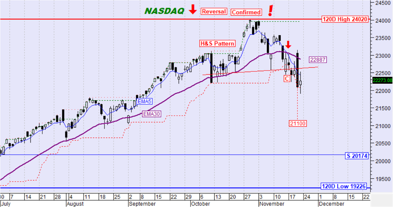Ο δείκτης NASDAQ την περασμένη εβδομάδα κινήθηκε καθοδικά και πέτυχε την καθοδική διάσπαση του ΕΜΑ30. Ο ΕΜΑ5 διέσπασε καθοδικά τον ΕΜΑ30 ενώ ταυτόχρονα η τιμή διέσπασε και το όριο επιβεβαίωσης αντιστροφής της τάσης με αποτέλεσμα τη σηματοδότηση επιβεβαιωμένης αντιστροφής της μεσοπρόθεσμης τάσης σε καθοδική. Παράλληλα ενεργοποιήθηκε μεσοπρόθεσμος σχηματισμός Ώμος-Κεφάλι-Ώμος που έχει καθοδικό στόχο στην περιοχή των 21100 μονάδων.