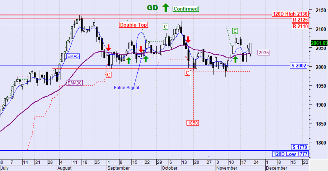 Ο ΓΔ την περασμένη εβδομάδα, παρέμεινε σχεδόν αμετάβλητος. Ο ΕΜΑ5 διατηρεί την τιμή του ψηλότερα από τον ΕΜΑ30 και έτσι διατηρείται η μεσοπρόθεσμη ανοδική τάση. Παραμένει ενεργός ο σχηματισμός διπλής κορυφής ο οποίος έχει καθοδικό στόχο στις 1850 μονάδες. Ακυρώνεται με υπέρβαση των 2110 μονάδων.
