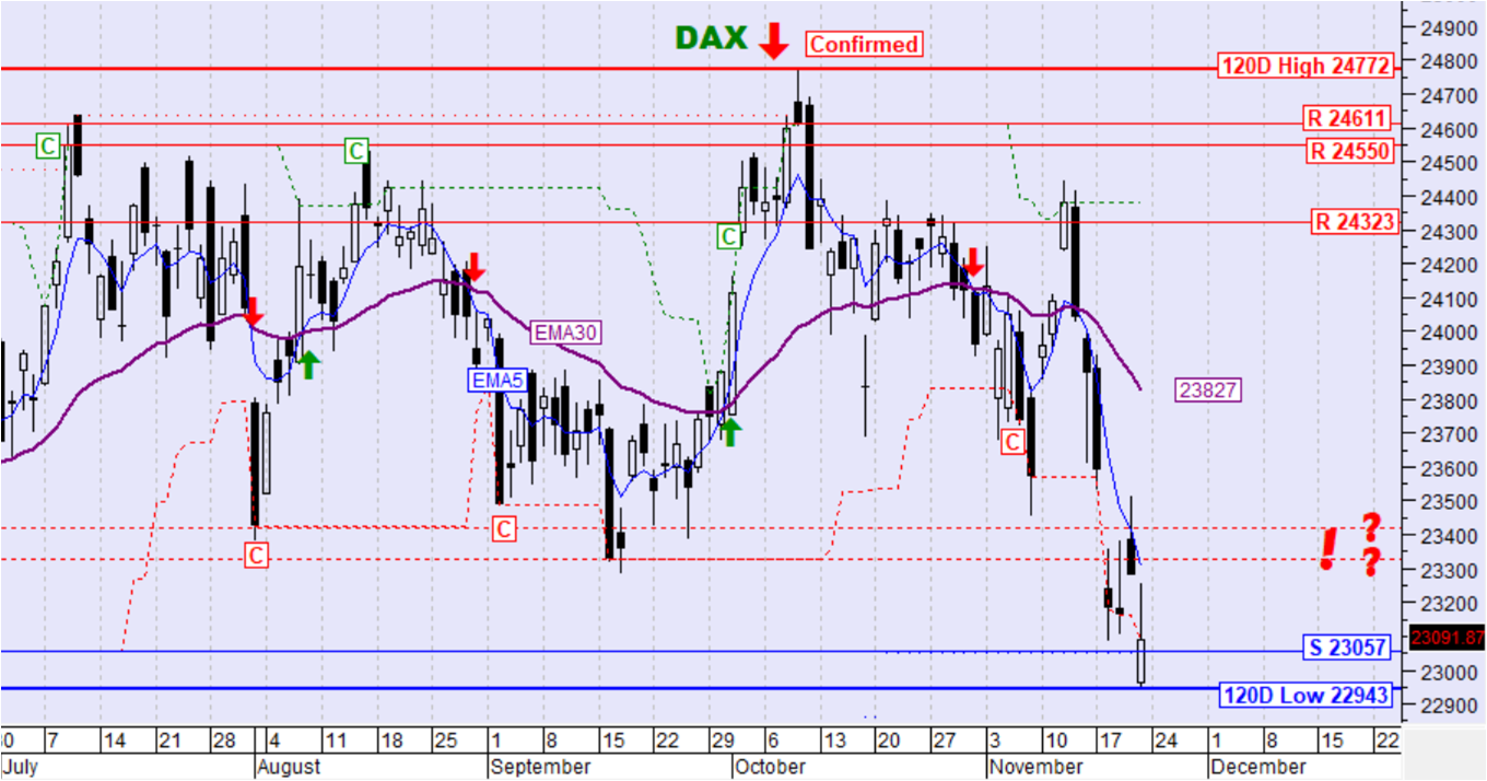 Ο Γερμανικός δείκτης την περασμένη εβδομάδα κινήθηκε καθοδικά πέτυχε νέο χαμηλό 120 ημερών και διατήρησε την τιμή χαμηλότερα του ΕΜΑ30. Επίσης ο ΕΜΑ5 διατηρεί την τιμή του χαμηλότερα του ΕΜΑ30 με αποτέλεσμα τη διατήρηση της μεσοπρόθεσμης επιβεβαιωμένης καθοδικής τάσης.