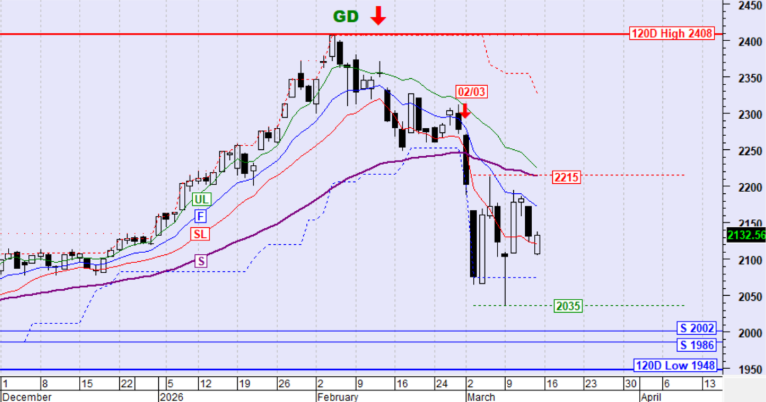 Ο ΓΔ κινήθηκε ανοδικά αλλά δεν σημείωσε αξιόλογη μεταβολή. Η τιμή του παραμένει εντός της περιοχής συσσώρευσης μεταξύ 2035 και 2215 μονάδων. Είναι μοιρασμένες οι πιθανότητες της ανοδικής κίνησης προς το άνω όριο και της καθοδικής κίνησης προς το κάτω όριο της περιοχής συσσώρευσης στο άνοιγμα της ερχόμενης εβδομάδας. Διατηρείται αμείωτη η αβεβαιότητα.