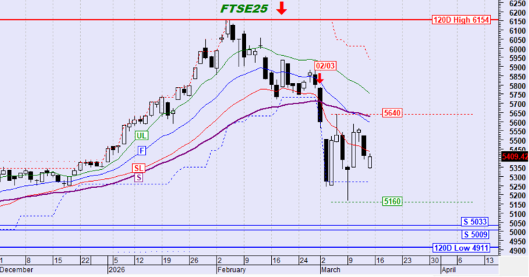 Ο FTSE25 κινήθηκε καθοδικά αλλά όπως και ο ΓΔ δεν σημείωσε αξιόλογη μεταβολή. Η τιμή του παραμένει εντός της περιοχής συσσώρευσης μεταξύ 5160 και 5640 μονάδων. Είναι μοιρασμένες οι πιθανότητες της ανοδικής κίνησης προς το άνω όριο και της καθοδικής κίνησης προς το κάτω όριο της περιοχής συσσώρευσης στο άνοιγμα της ερχόμενης εβδομάδας.