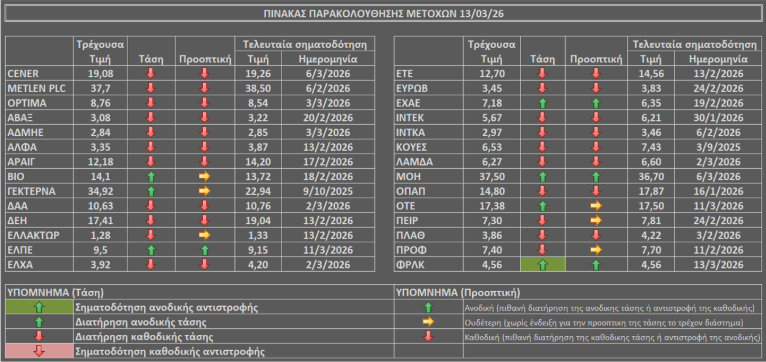 Η τάση και προοπτική των μετοχών του καλαθιού παρακολούθησης (διαμόρφωση με το κλείσιμο της Παρασκευής 13/03) είναι όπως στον παρακάτω πίνακα