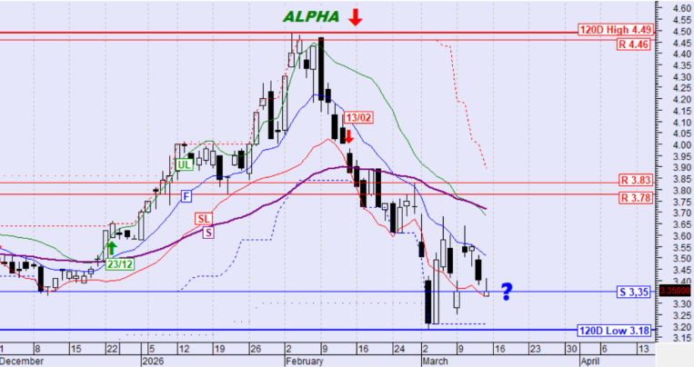 Η τιμή της μετοχής κινήθηκε καθοδικά και έκλεισε ακριβώς πάνω στη στήριξη στα 3,35€ δημιουργώντας αμφιβολίες όσον αφορά στο αν θα μπορέσει εκεί να συγκρατηθεί η καθοδική πορεία ή αν θα συνεχίσει προς το χαμηλό των 120 ημερών.