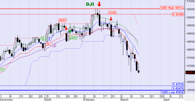 Ο DJI κινήθηκε καθοδικά και διατηρεί την καθοδική τάση. Δεν υφίστανται κάποιες στηρίξεις κοντά στην τιμή του δείκτη αφήνοντας περιθώριο για συνέχιση της καθόδου προς την περιοχή των 46000 μονάδων