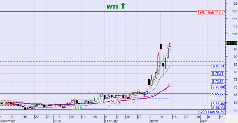 Η τιμή του πετρελαίου κινήθηκε έντονα ανοδικά και πέτυχε νέο υψηλό 120 ημερών. Η τιμή κατάφερε να προσεγγίσει τα 120$ και στη συνέχεια διόρθωσε έντονα, χωρίς όμως να κλονιστεί η ανοδική τάση αφού ανέκαμψε ανοδικά και έκλεισε την εβδομάδα κοντά στα 100$. Δεν μπορεί αυτή τη στιγμή να προσδιοριστεί με ασφάλεια ένα επίπεδο στο οποίο θα ανακοπεί η ανοδική πορεία της τιμής κάτι που θα εξαρτηθεί από τις εξελίξεις στη μέση ανατολή.