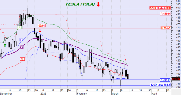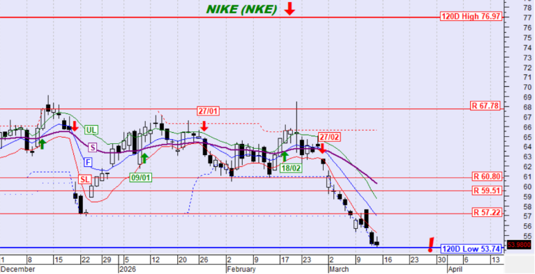 Η μετοχή κινήθηκε καθοδικά και διατηρεί την τιμή χαμηλότερα των UL,F,SL και S με αποτέλεσμα τη διατήρηση της καθοδικής τάσης. Η τιμή έφτασε στη στήριξη στα 391$ η οποία αν αντέξει για ακόμη μία φορά στην πίεση μπορεί να προκαλέσει κάποια ανοδική αντίδραση
