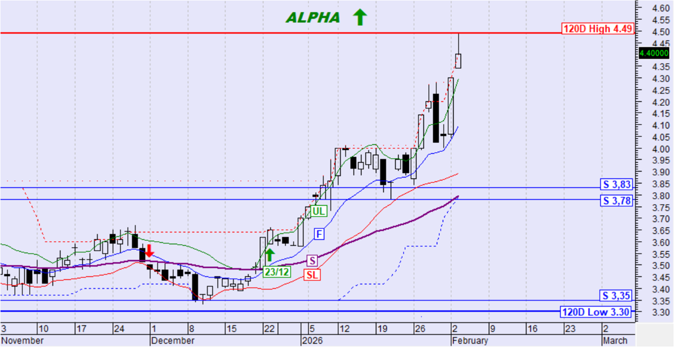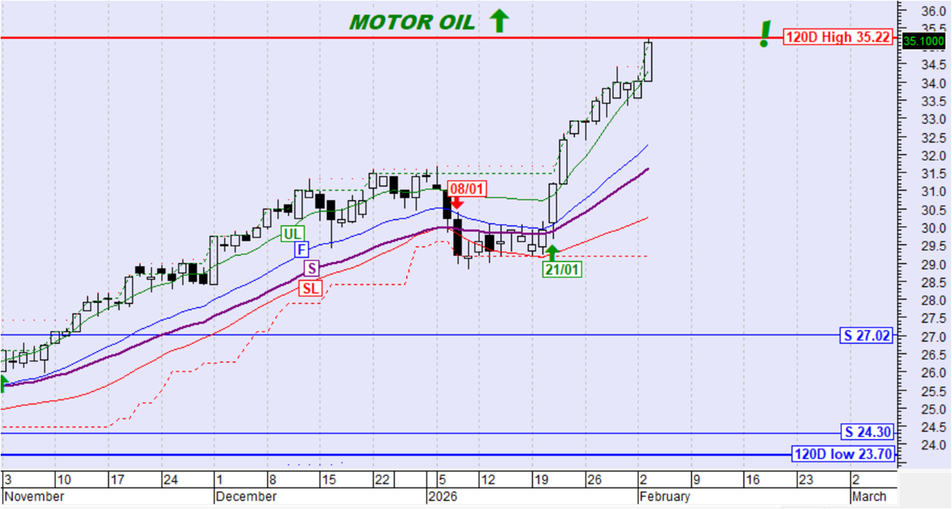 Η μετοχή κινήθηκε ανοδικά και πέτυχε νέο υψηλό 120 ημερών. Η τιμή παραμένει ψηλότερα της SL και του αργού κινητού μέσου όρου S έτσι διατηρείται η ανοδική τάση.