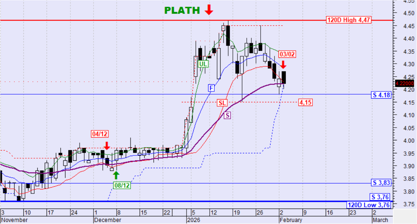 Η σηματοδότηση είναι μέτριας ως χαμηλής αξιοπιστίας λόγω της οριακής διάσπασης των SL και S και της ύπαρξης της στήριξης στα 4,18€ ενώ επιβεβαιώνεται με καθοδική διάσπαση των 4,15€ η οποία ενεργοποιεί καθοδικό σχηματισμό διπλής κορυφής.