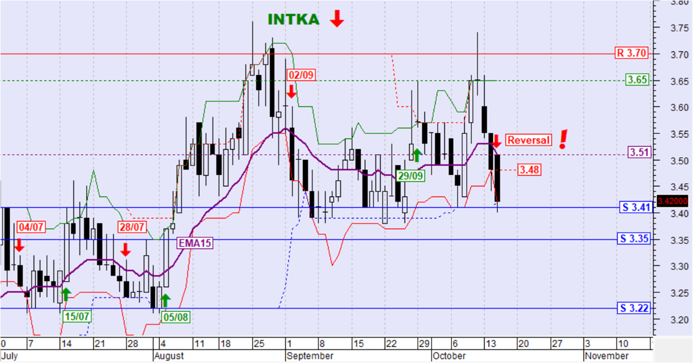 Βραχυπρόθεσμη τάση: αντιστράφηκε σε καθοδική με την καθοδική διάσπαση των 3.48€ στο κλείσιμο