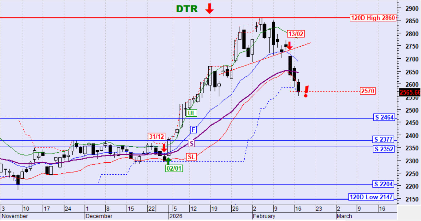 Επιτεύχθηκε ο καθοδικός στόχος στην περιοχή των 2570 μονάδων του τοπικού σχηματισμού ΩΚΩ. Αυτό είναι πιθανό να φέρει μια ανοδική αντιστροφή χωρίς να αποκλείεται όμως η αναζήτηση στήριξης στην πρώτη στήριξη στις 2464 μονάδες.