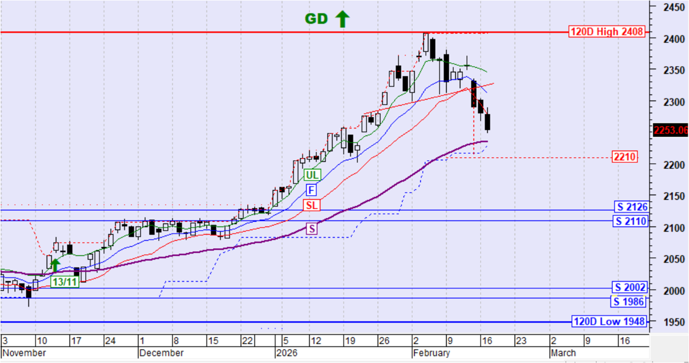 Ο ΓΔ κινήθηκε διορθωτικά χωρίς σηματοδότηση. Η τιμή παραμένει ψηλότερα του αργού κινητού μέσου όρου S έτσι διατηρείται η ανοδική τάση. Παραμένει ενεργός ο τοπικός σχηματισμός ΩΚΩ που έχει καθοδικό στόχο στην περιοχή των 2210 μονάδων.