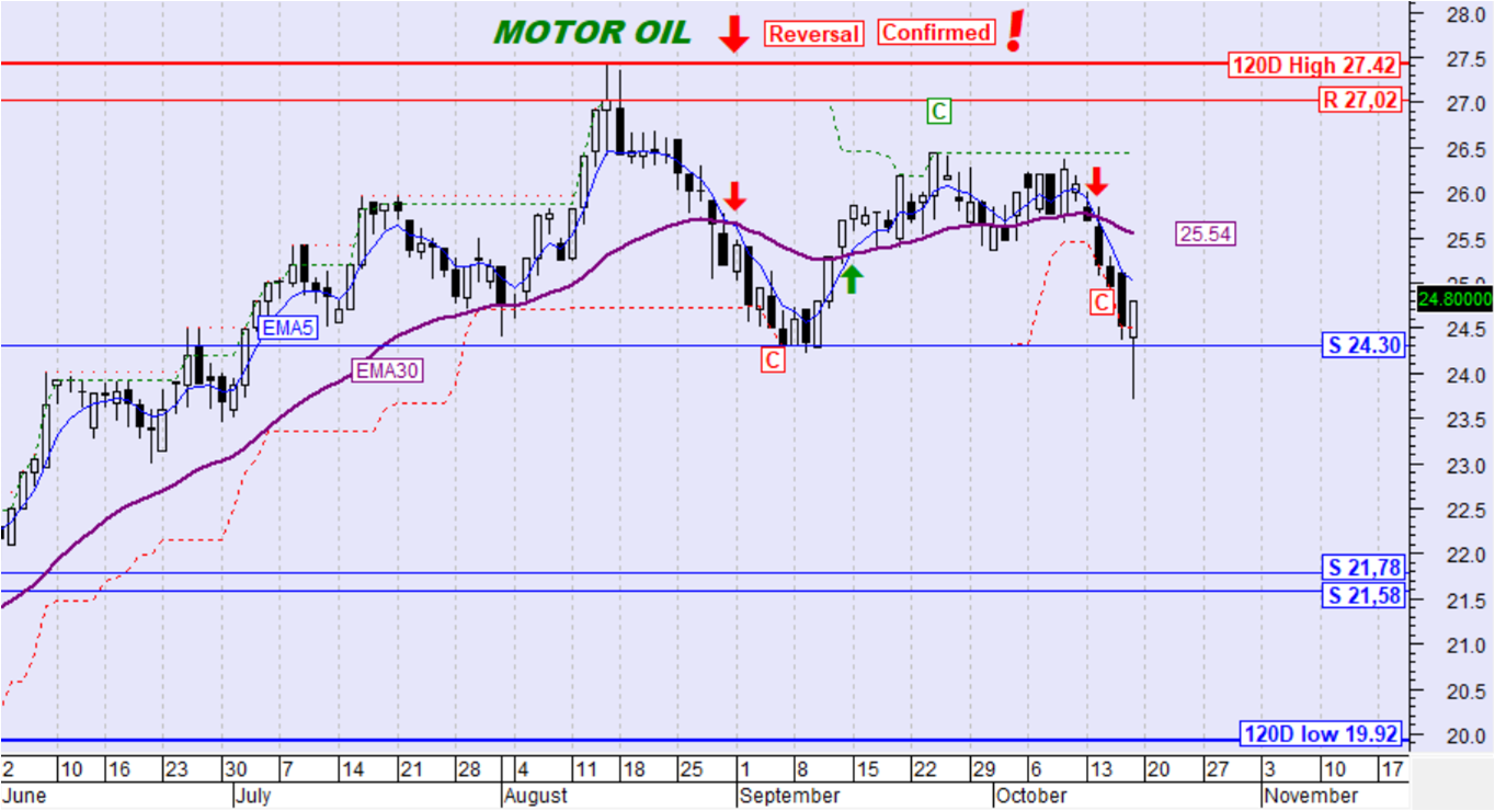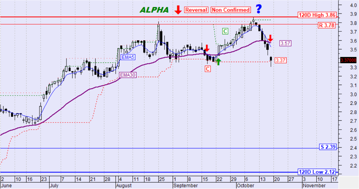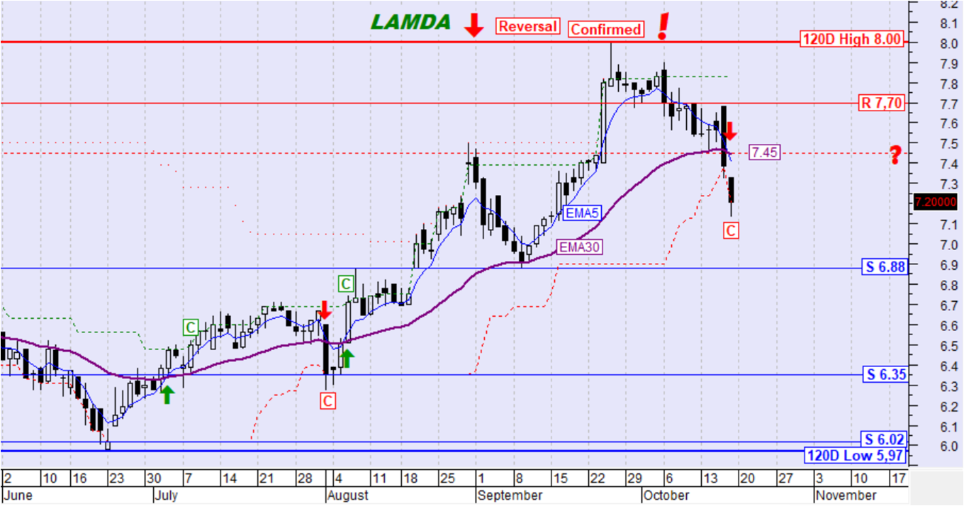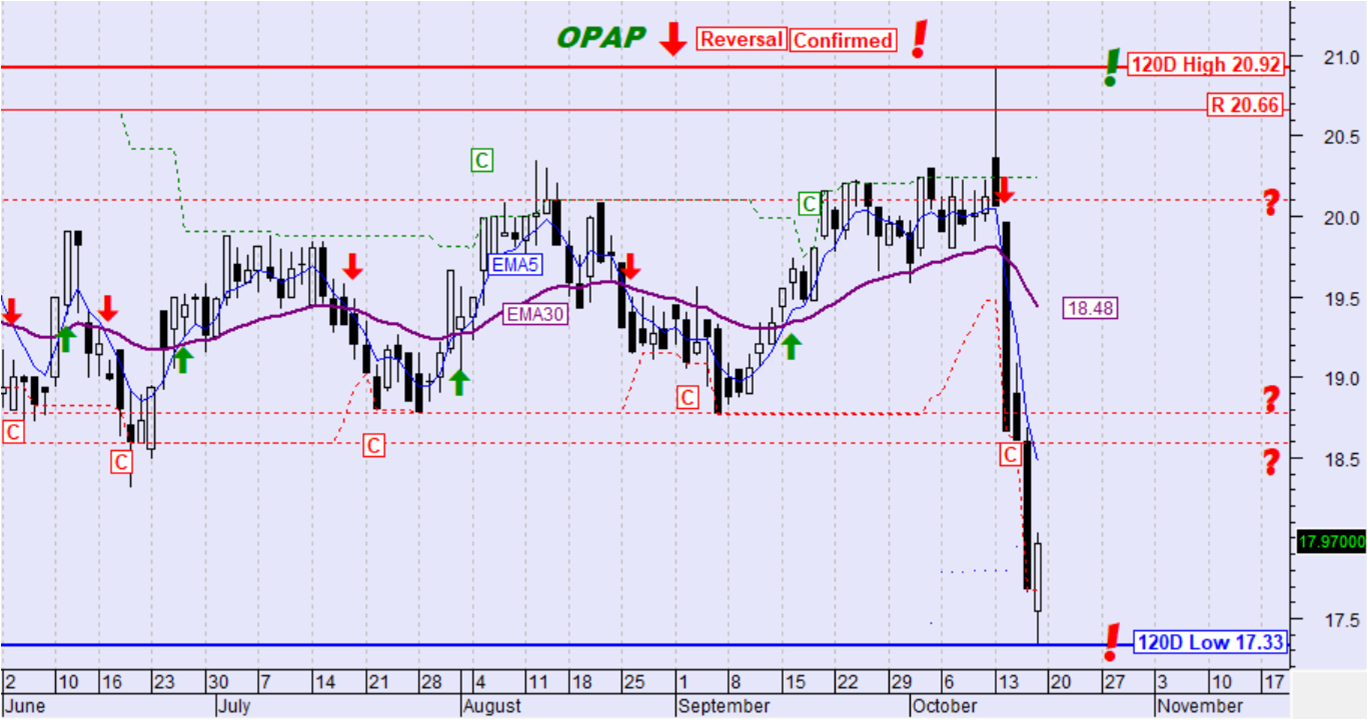 Η μετοχή την περασμένη εβδομάδα κινήθηκε έντονα στο πλαίσιο της συνένωσης της εταιρίας με την Allwyn. Αρχικά κινήθηκε ανοδικά και στο υψηλό της Δευτέρας 13/10 πέτυχε νέο υψηλό για να γυρίσει στη συνέχεια καθοδικά και να πετύχει την καθοδική διάσπαση του ΕΜΑ30. Ο ΕΜΑ5 διέσπασε καθοδικά τον ΕΜΑ30 ενώ ταυτόχρονα η τιμή διέσπασε και το όριο επιβεβαίωσης αντιστροφής της τάσης με αποτέλεσμα τη σηματοδότηση επιβεβαιωμένης αντιστροφής της μεσοπρόθεσμης τάσης σε καθοδική.