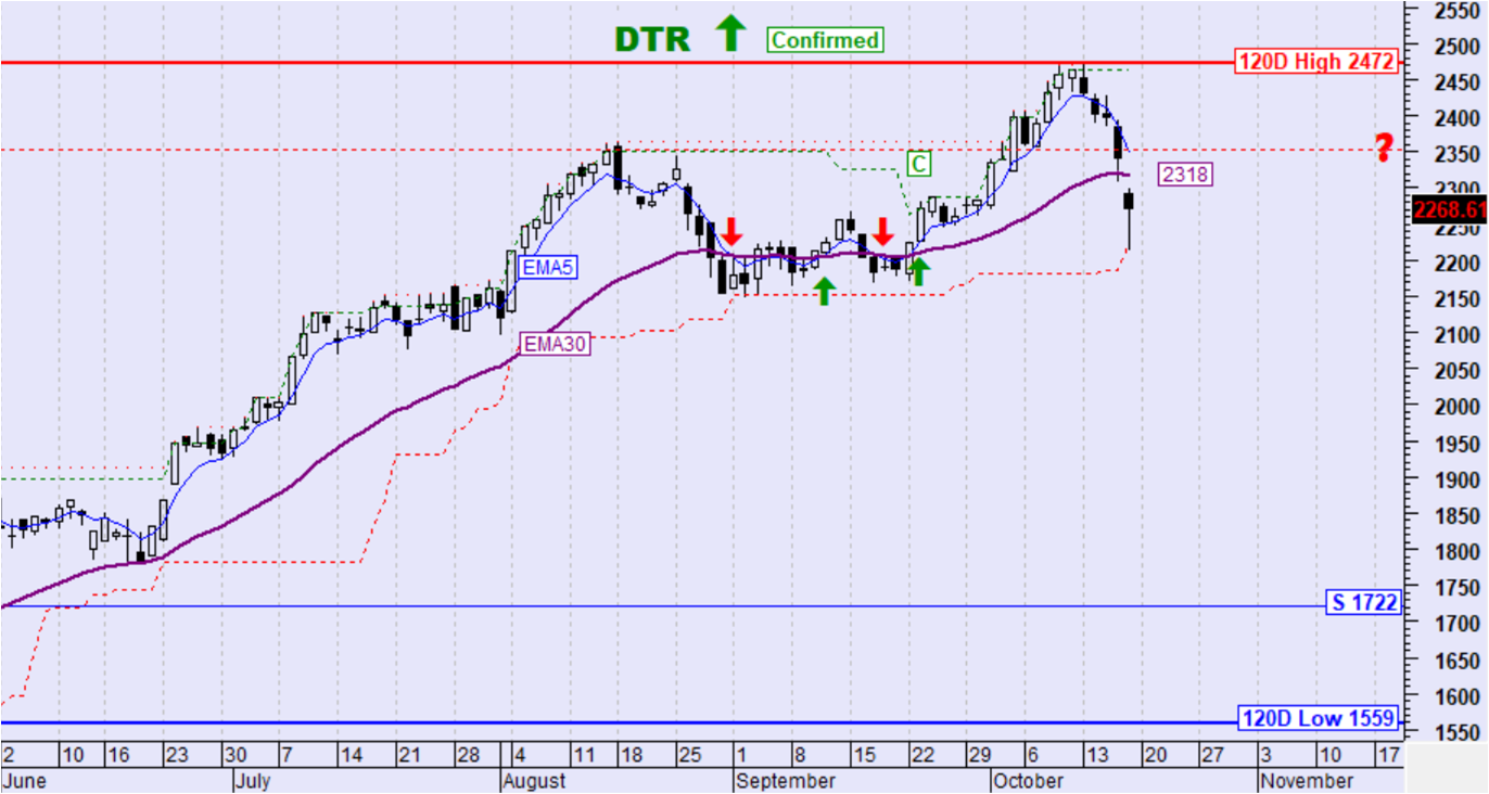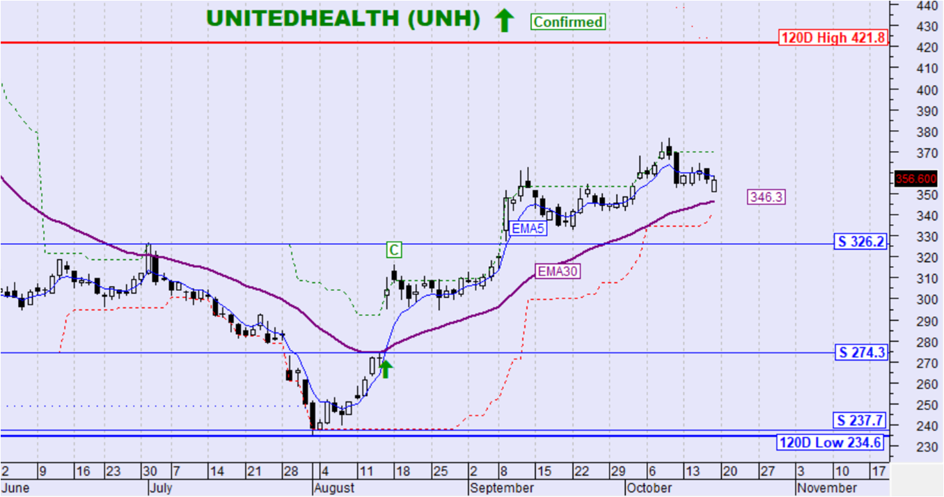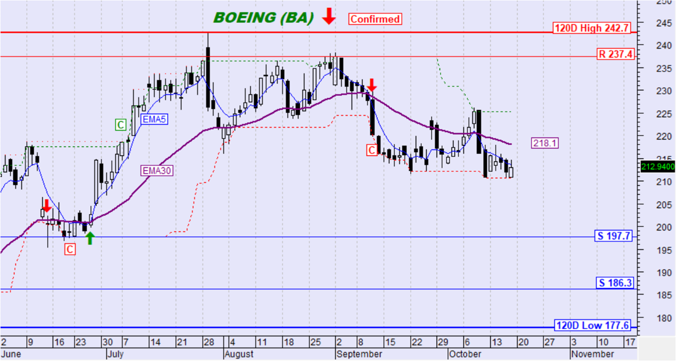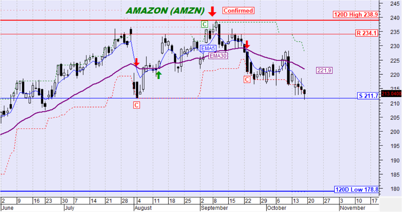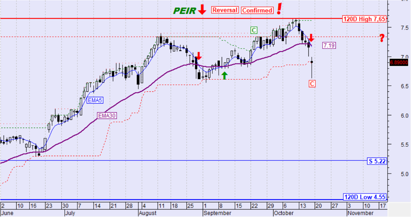 Η μετοχή την περασμένη εβδομάδα κινήθηκε έντονα στο πλαίσιο της συνένωσης της εταιρίας με την Allwyn. Αρχικά κινήθηκε ανοδικά και στο υψηλό της Δευτέρας 13/10 πέτυχε νέο υψηλό για να γυρίσει στη συνέχεια καθοδικά και να πετύχει την καθοδική διάσπαση του ΕΜΑ30. Ο ΕΜΑ5 διέσπασε καθοδικά τον ΕΜΑ30 ενώ ταυτόχρονα η τιμή διέσπασε και το όριο επιβεβαίωσης αντιστροφής της τάσης με αποτέλεσμα τη σηματοδότηση επιβεβαιωμένης αντιστροφής της μεσοπρόθεσμης τάσης σε καθοδική.