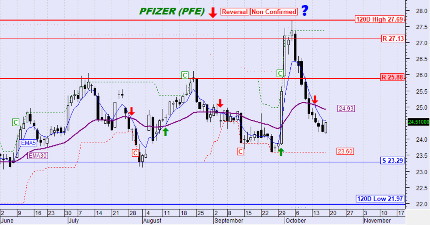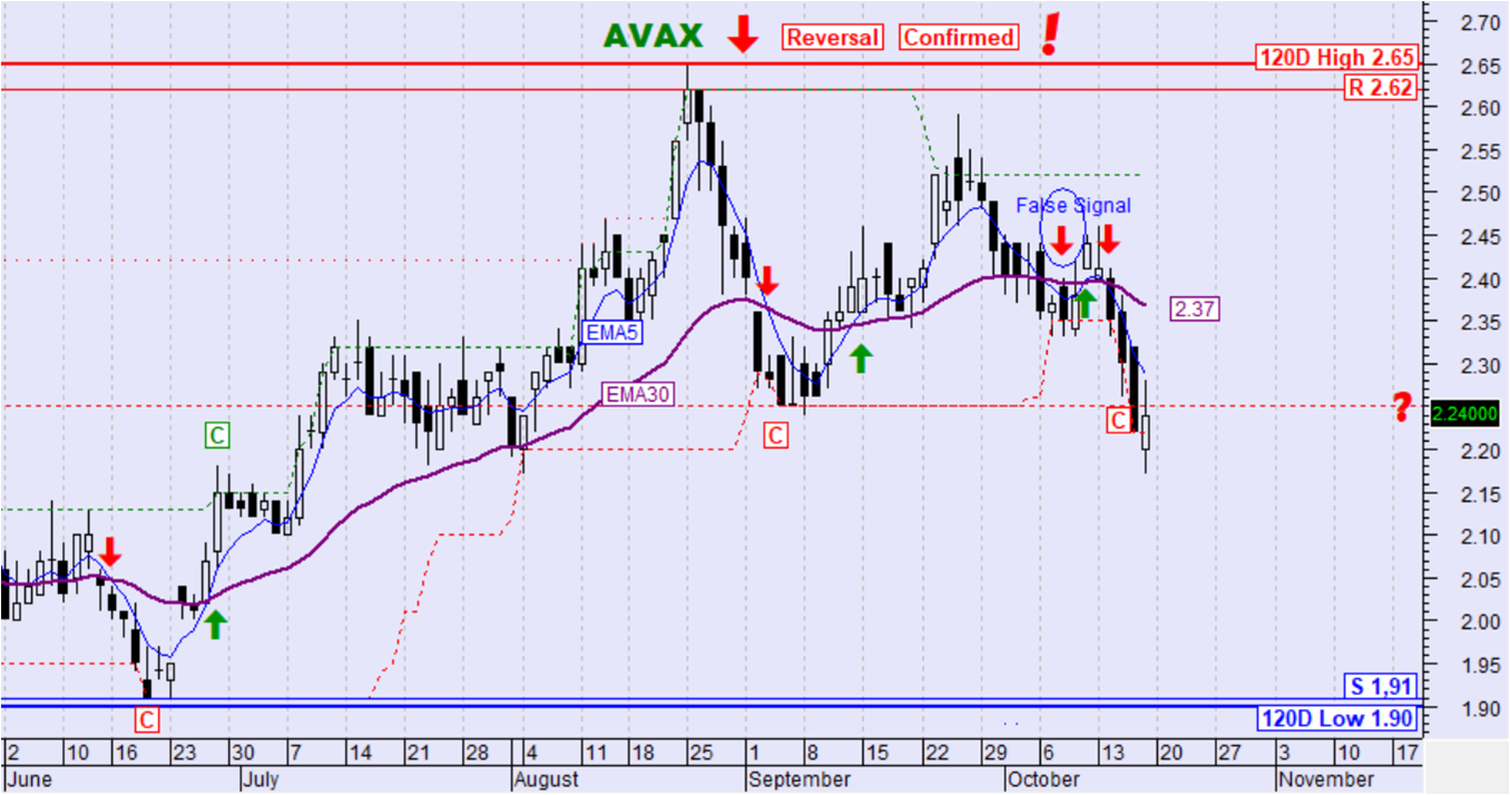 Η μετοχή την περασμένη εβδομάδα κινήθηκε καθοδικά και πέτυχε την καθοδική διάσπαση του ΕΜΑ30. Ο ΕΜΑ5 διέσπασε καθοδικά τον ΕΜΑ30 με αποτέλεσμα τη σηματοδότηση μη επιβεβαιωμένης αντιστροφής της μεσοπρόθεσμης τάσης σε καθοδική. Η σηματοδότηση επιβεβαιώνεται με καθοδική διάσπαση του ορίου επιβεβαίωσης αντιστροφής της τάσης.