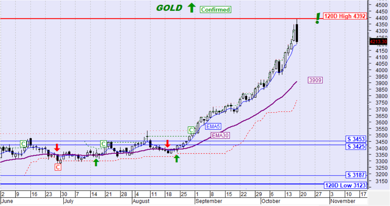 Η τιμή του χρυσού την περασμένη εβδομάδα κινήθηκε ανοδικά και πέτυχε νέο υψηλό 120 ημερών φτάνοντας κοντά στα 4400$. Ο ΕΜΑ5 διατηρεί την τιμή του ψηλότερα και μακριά από τον ΕΜΑ30 και έτσι διατηρείται η μεσοπρόθεσμη ανοδική τάση.