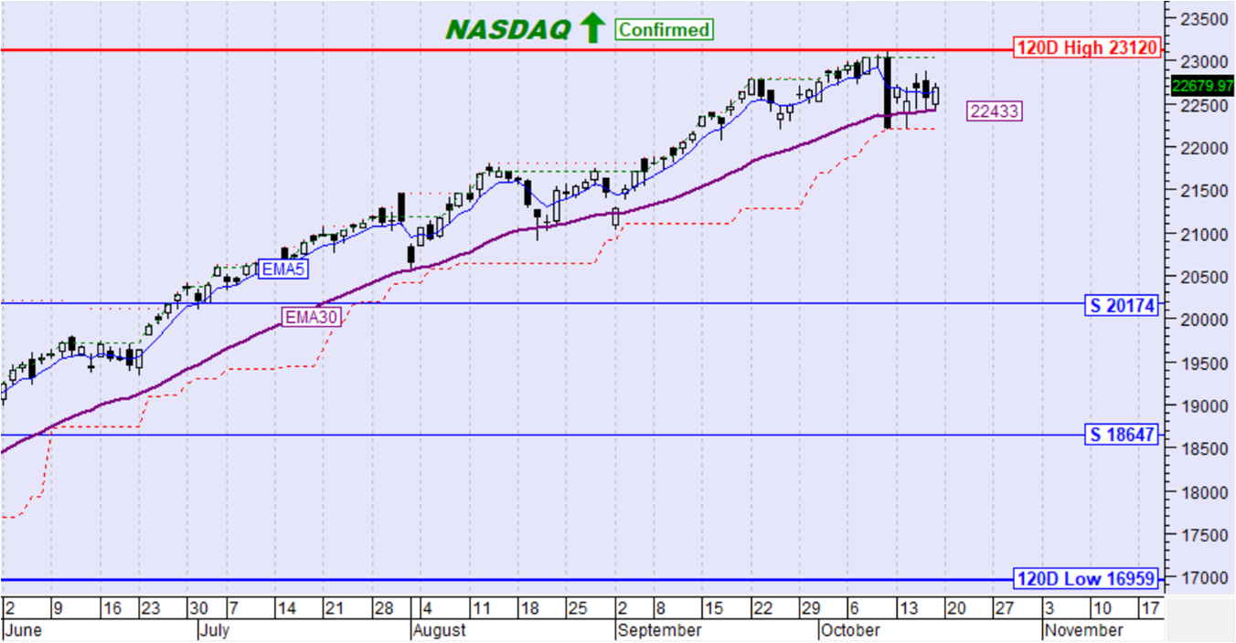 Ο δείκτης NASDAQ την περασμένη εβδομάδα κινήθηκε ήπια ανοδικά χωρίς σηματοδότηση. Ο ΕΜΑ5 διατηρεί την τιμή του ψηλότερα από τον ΕΜΑ30 και έτσι διατηρείται η μεσοπρόθεσμη ανοδική τάση.