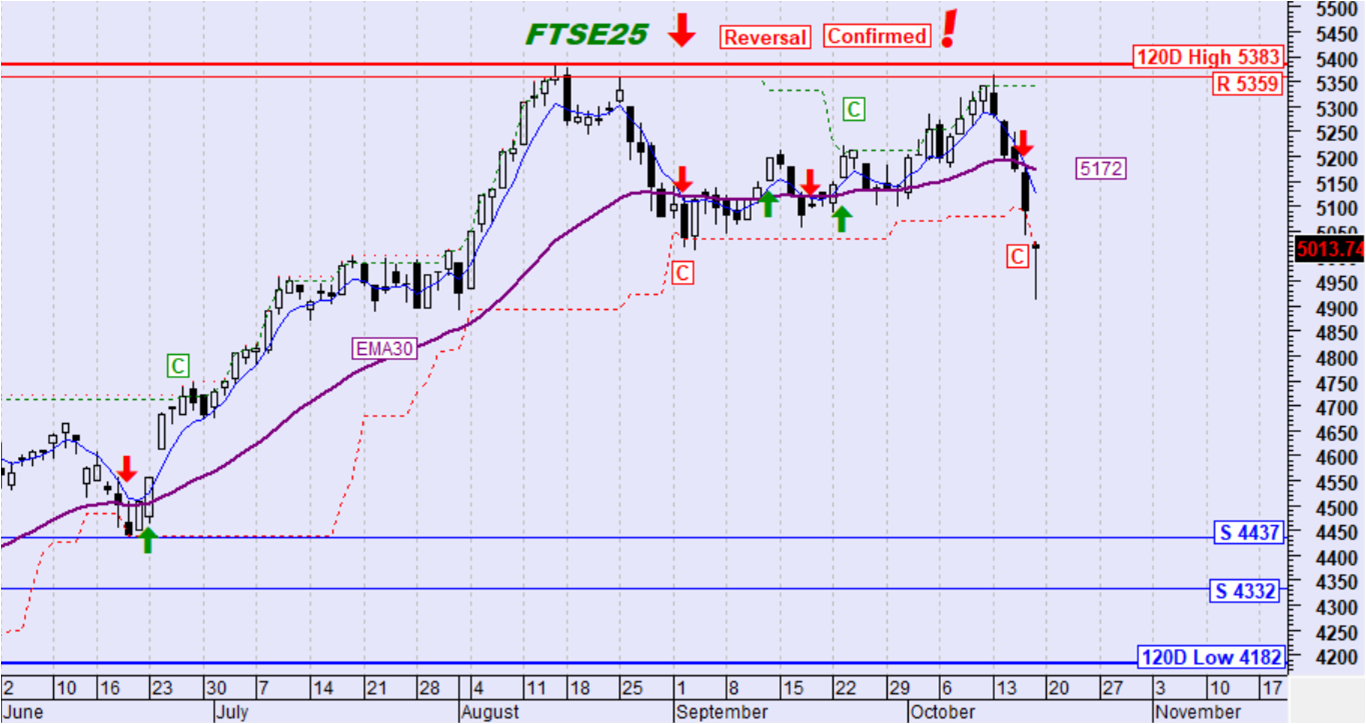 Ο FTSE25 την περασμένη εβδομάδα, κινήθηκε καθοδικά και πέτυχε την καθοδική διάσπαση του ΕΜΑ30. Ο ΕΜΑ5 διέσπασε καθοδικά τον ΕΜΑ30 ενώ ταυτόχρονα η τιμή διέσπασε και το όριο επιβεβαίωσης αντιστροφής της τάσης με αποτέλεσμα τη σηματοδότηση επιβεβαιωμένης αντιστροφής της μεσοπρόθεσμης τάσης σε καθοδική.