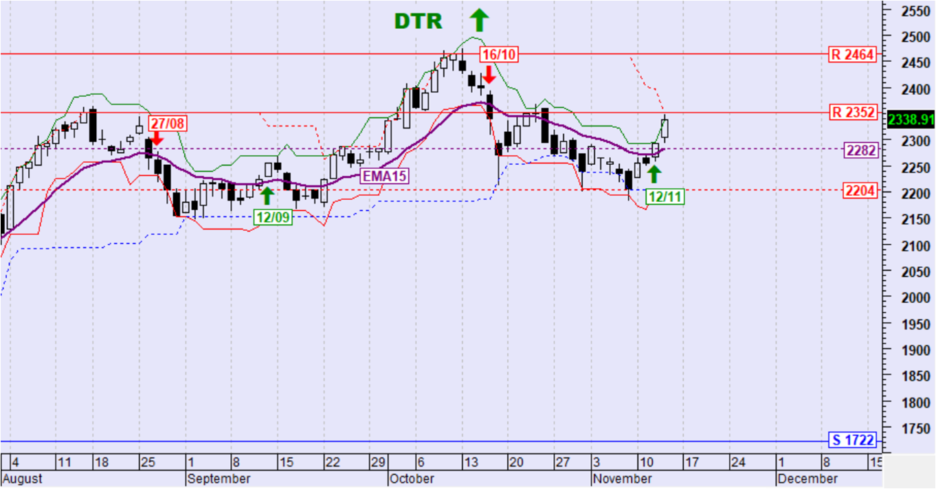 ο Εκθετικός Μέσος Όρος των 15 ημερών (ΕΜΑ15) στις 2282 μονάδες