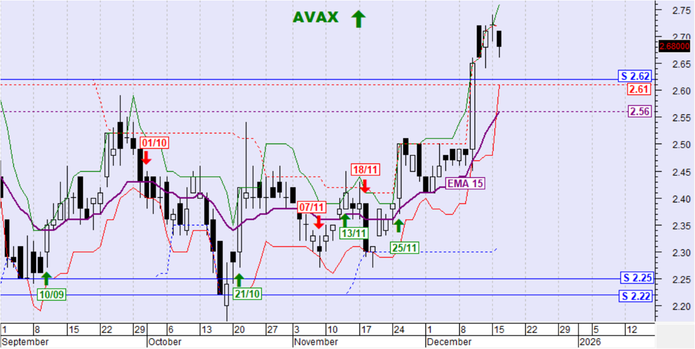 Ημερήσιο όριο αντιστροφής της βραχυπρόθεσμης τάσης σε καθοδική: 2.61€ (κλείσιμο)