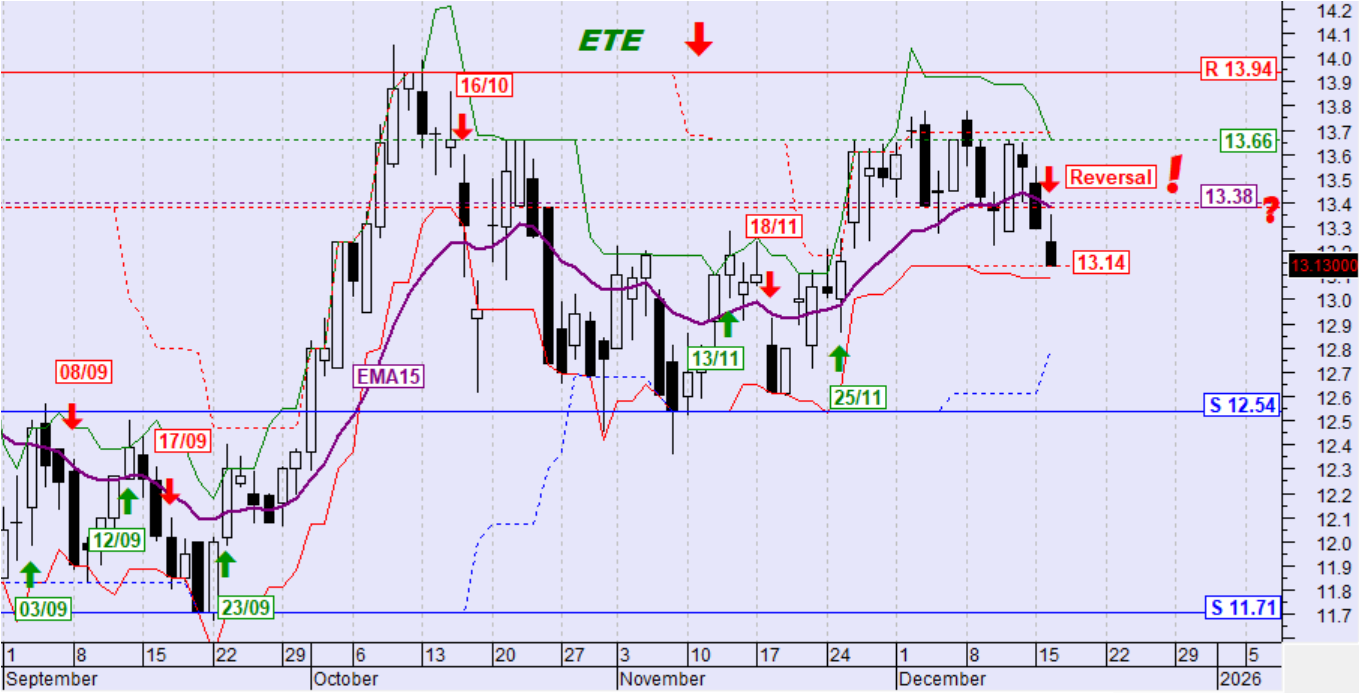Βραχυπρόθεσμη τάση: αντιστράφηκε σε καθοδική με την καθοδική διάσπαση των 13.14€ στο κλείσιμο