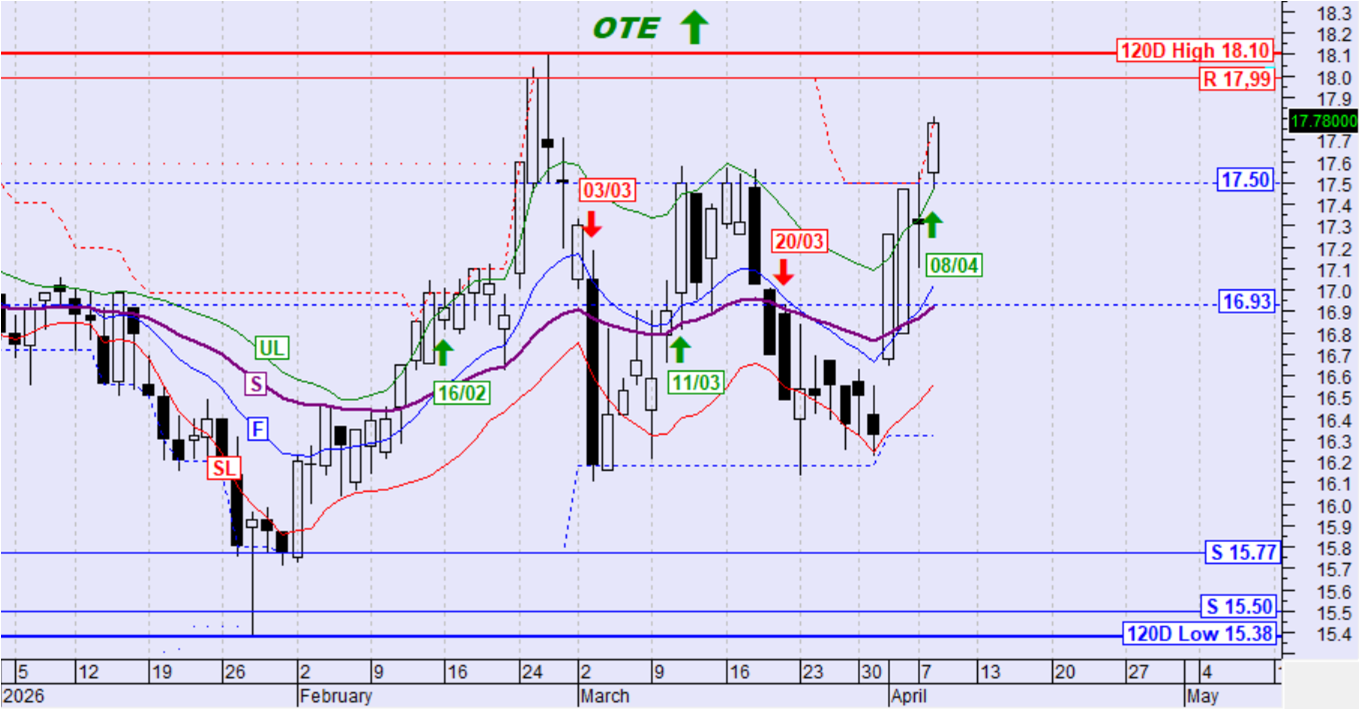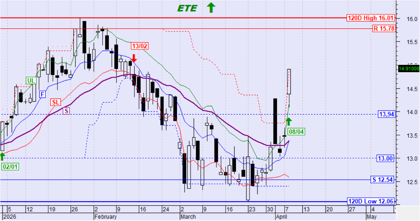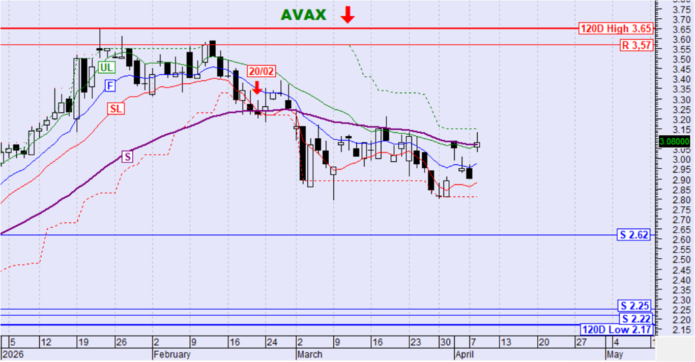 Η μετοχή γύρισε ανοδικά και πέτυχε την υπέρβαση του αργού κινητού μέσου όρου S ο οποίος ασκούσε πίεση στην τιμή της μετοχής. Δεν υπάρχουν αντιστάσεις που να επηρεάζουν άμεσα την διακύμανση της τιμής οπότε είναι πιθανό να φτάσει μέχρι και την αντίσταση στα 3,57€ ενώ σε περίπτωση πισωγυρίσματος σημαντική είναι η διατήρηση ως στήριξης του αργού κινητού μέσου όρου. .