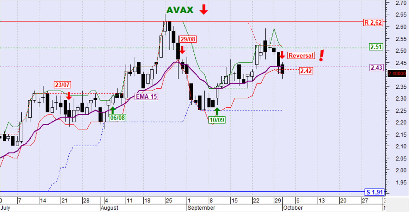 Βραχυπρόθεσμη τάση: αντιστράφηκε σε καθοδική με την καθοδική διάσπαση των 2.42€ στο κλείσιμο