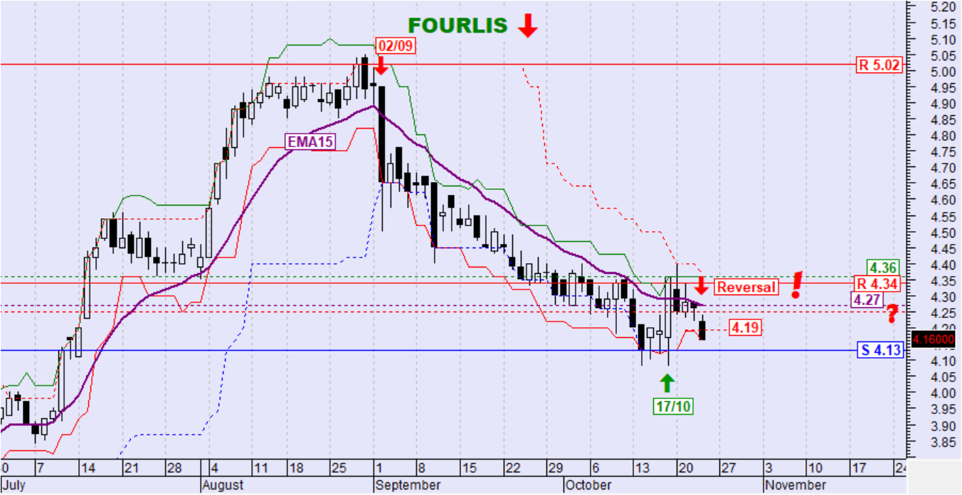 Βραχυπρόθεσμη τάση: αντιστράφηκε σε καθοδική με την καθοδική διάσπαση των 4.19€ στο κλείσιμο