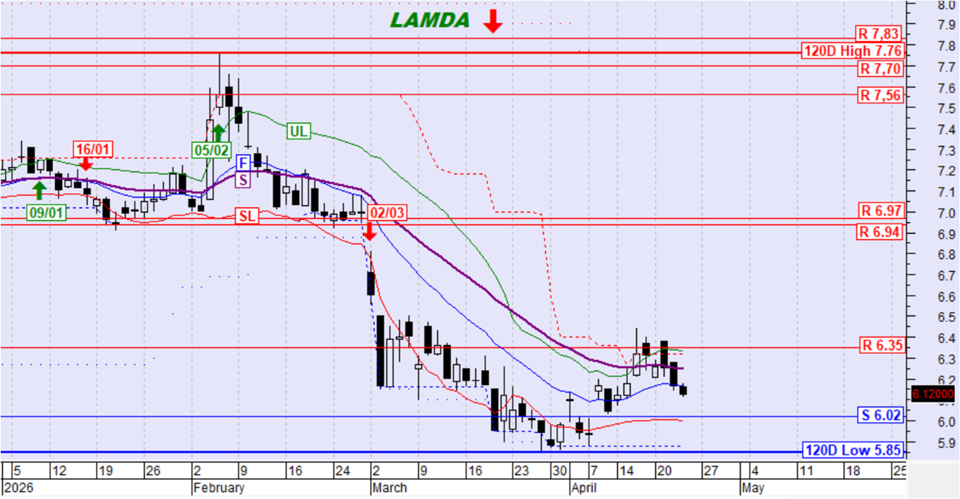 Η μετοχή υπό την πίεση της αντίστασης στα 6,35€ κινήθηκε καθοδικά χωρίς σηματοδότηση. Παραμένει υπό την πίεση του αργού κινητού μέσου όρου S και διατηρεί την καθοδική τάση.