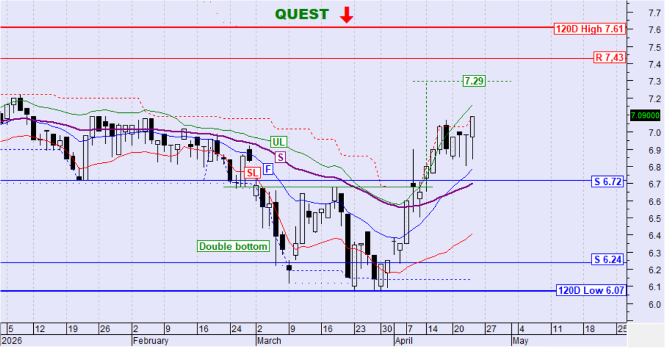 Η μετοχή κινήθηκε ανοδικά και διατηρεί την τιμή της ψηλότερα των F,S και SL. Δεν υπάρχει καθαρή σηματοδότηση ανοδικής αντιστροφής και έτσι διατηρείται οριακά η καθοδική τάση όμως η μετοχή κινείται προς τον στόχο του σχηματισμού διπλού πυθμένα στα 7,29€.