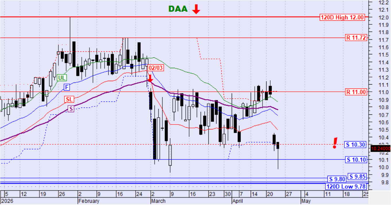Η μετοχή αφού απέτυχε την υπέρβαση της αντίστασης στα 11.00€ κινήθηκε καθοδικά, διέσπασε τη στήριξη στα 10,30€ και διατηρεί την καθοδική τάση. Πιθανή η στήριξη στο επίπεδο των 10,10€ το οποίο ήδη δοκιμάζεται.