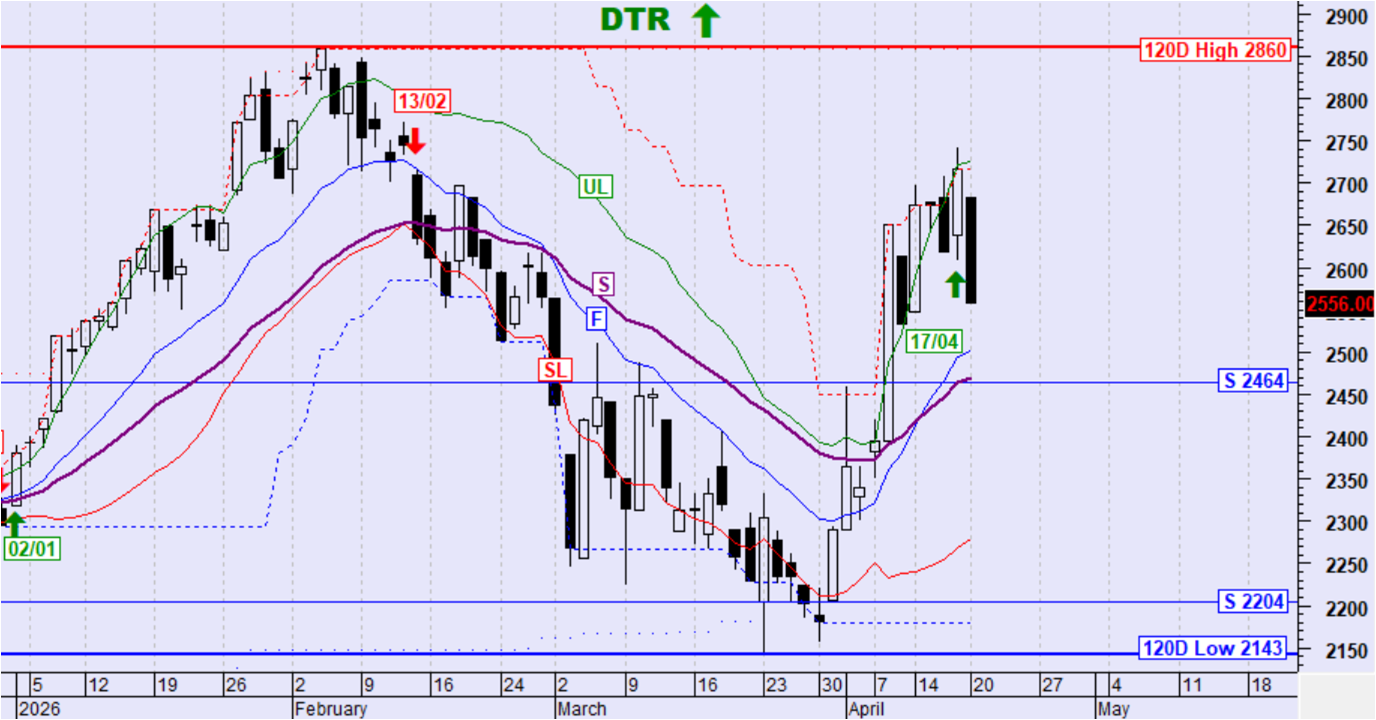 Ο ΓΔ κινήθηκε διορθωτικά χωρίς σηματοδότηση και διατηρείται η ανοδική τάση. Δεν υπάρχουν αντιστάσεις ψηλότερα της τιμής του δείκτη και έτσι υφίστανται πιθανότητες συνέχισης της ανόδου μέχρι το υψηλό των 120 ημερών όσο η τιμή παραμένει ψηλότερα του αργού κινητού μέσου όρου S.