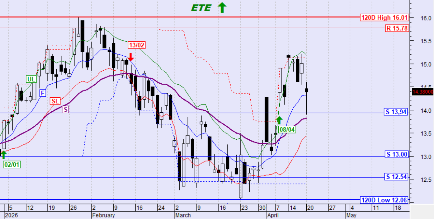 Η μετοχή κινήθηκε διορθωτικά χωρίς σηματοδότηση. Η τιμή παραμένει ψηλότερα της SL και του αργού κινητού μέσου όρου S έτσι διατηρείται η ανοδική τάση. Στο χαμηλό της ημέρας έφτασε στη στήριξη στα 13,94 για να αντιδράσει στη συνέχεια ανοδικά και να κλείσει αρκετά ψηλότερα