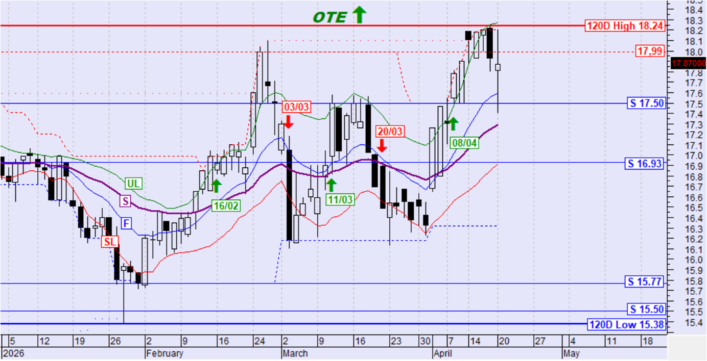 Η μετοχή κινήθηκε διορθωτικά χωρίς σηματοδότηση. Η τιμή παραμένει ψηλότερα της SL και του αργού κινητού μέσου όρου S έτσι διατηρείται η ανοδική τάση. Στο χαμηλό της ημέρας δοκίμασε με επιτυχία τη στήριξη στα 17,50€ από όπου γύρισε για να κλείσει αρκετά ψηλότερα.