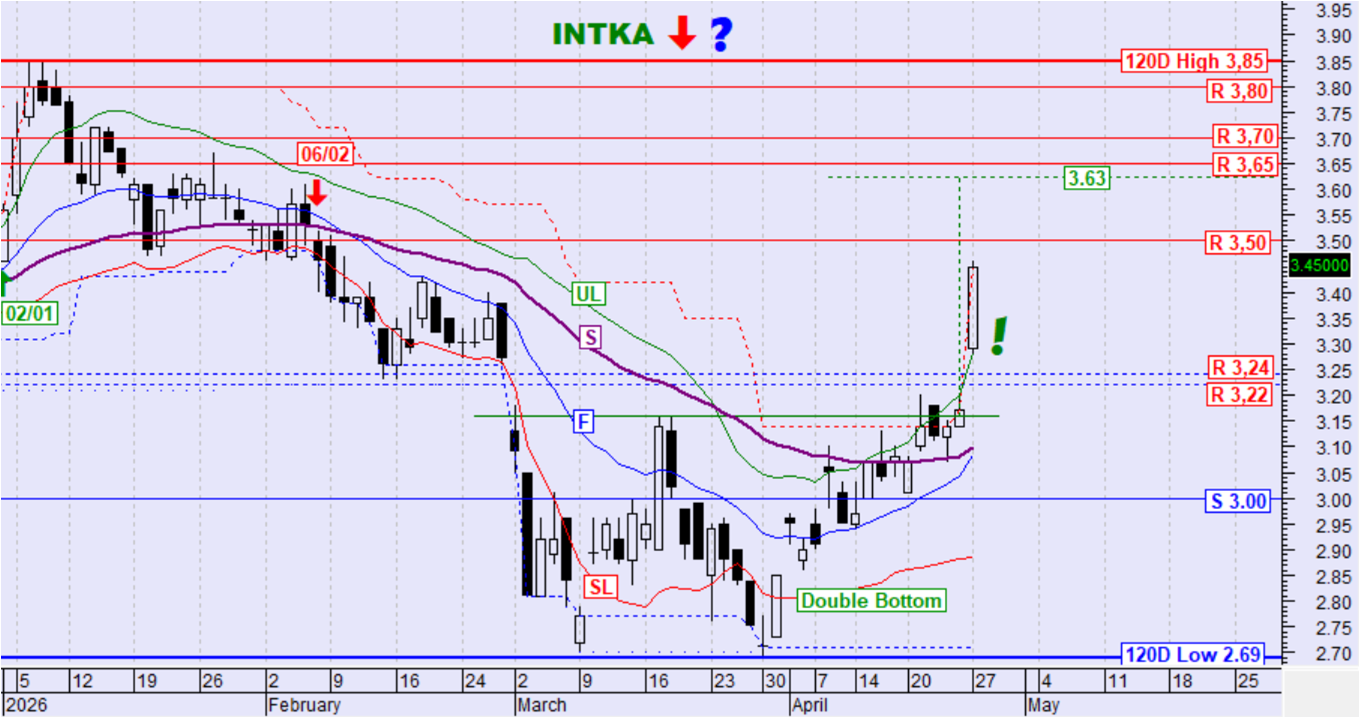 Η μετοχή κινήθηκε έντονα ανοδικά και πέτυχε την υπέρβαση της UL όμως ο γρήγορος κινητός μέσος όρος F παραμένει χαμηλότερα του αργού S και έτσι τυπικά διατηρείται οριακά η καθοδική τάση. Ολοκληρώθηκε ο σχηματισμός διπλού πυθμένα που βρισκόταν υπό κατασκευή και ενεργοποιήθηκε ανοδικός στόχος ψηλότερα στα 3,63€.