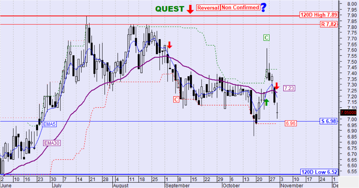 Η μετοχή την περασμένη εβδομάδα κινήθηκε καθοδικά και πέτυχε την καθοδική διάσπαση του ΕΜΑ30. Ο ΕΜΑ5 διέσπασε καθοδικά τον ΕΜΑ30 με αποτέλεσμα τη σηματοδότηση μη επιβεβαιωμένης αντιστροφής της μεσοπρόθεσμης τάσης σε καθοδική. Η σηματοδότηση επιβεβαιώνεται με καθοδική διάσπαση του ορίου επιβεβαίωσης αντιστροφής της τάσης