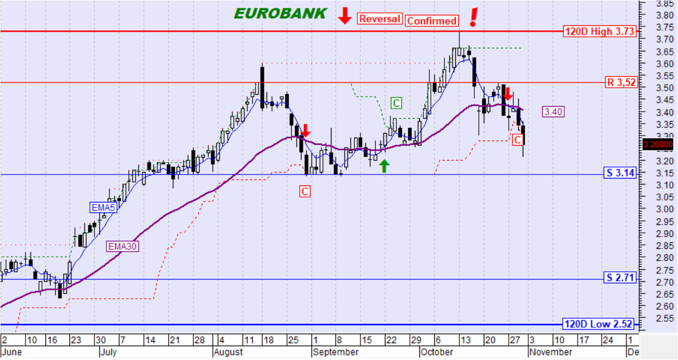 Η μετοχή την περασμένη εβδομάδα κινήθηκε καθοδικά. Ο ΕΜΑ5 διέσπασε καθοδικά τον ΕΜΑ30 ενώ 2 ημέρες αργότερα η τιμή διέσπασε και το όριο επιβεβαίωσης αντιστροφής της τάσης με αποτέλεσμα τη σηματοδότηση επιβεβαιωμένης αντιστροφής της μεσοπρόθεσμης τάσης σε καθοδική.
