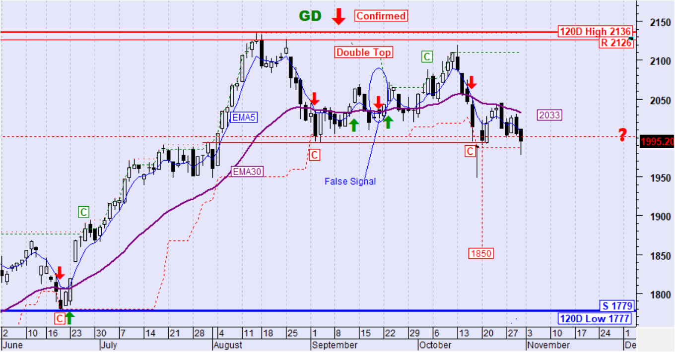 Ο ΓΔ την περασμένη εβδομάδα, κινήθηκε καθοδικά και διατήρησε την τιμή χαμηλότερα του ΕΜΑ30. Επίσης ο ΕΜΑ5 διατηρεί την τιμή του χαμηλότερα του ΕΜΑ30 με αποτέλεσμα τη διατήρηση της μεσοπρόθεσμης επιβεβαιωμένης καθοδικής τάσης. Παραμένει ενεργός ο σχηματισμός διπλής κορυφής ο οποίος έχει καθοδικό στόχο στις 1850 μονάδες.