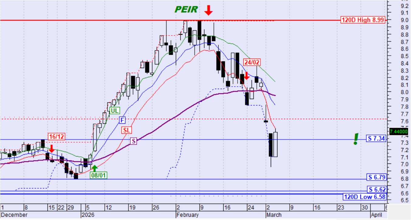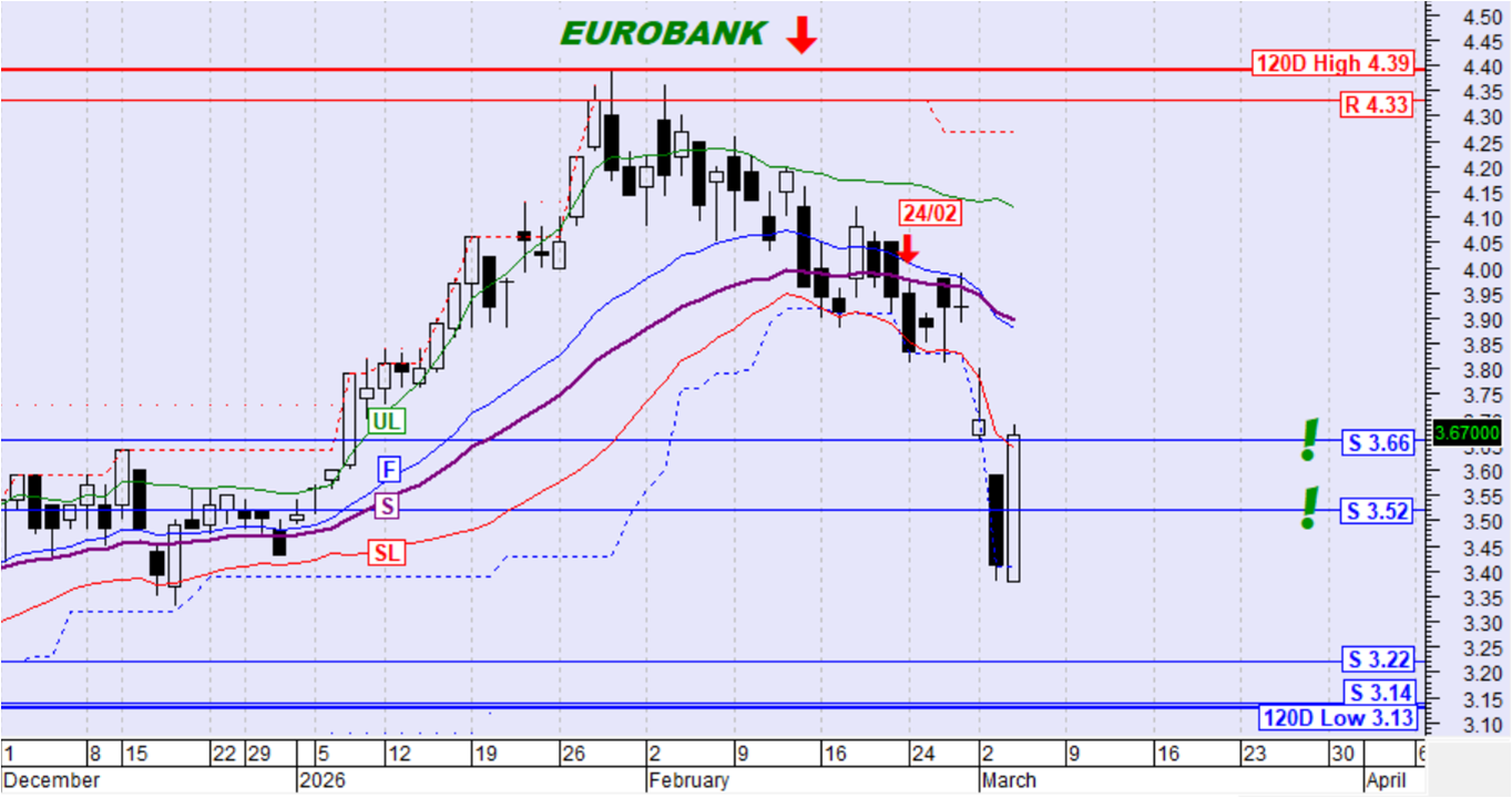 Η μετοχή αντέδρασε ανοδικά, ανέκτησε και ενεργοποίησε ξανά το ζεύγος στηρίξεων στα 3,66€-3,52€ ανακτώντας ταυτόχρονα και όλες τις χθεσινές απώλειες. Δεν υπάρχει ακόμη ένδειξη για το αν το ζεύγος στηρίξεων στις 3,66€-3,52€ μονάδες θα αποδειχθεί ισχυρό ως στήριξη η αν θα διασπαστεί ξανά τις επόμενες ημέρες