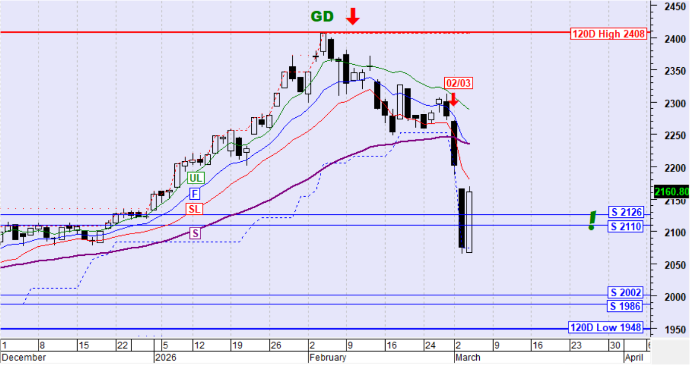 Ο ΓΔ κινήθηκε ανοδικά, ανέκτησε και ενεργοποίησε ξανά το ζεύγος στηρίξεων στις 2126-2110 μονάδες ανακτώντας ταυτόχρονα και μεγάλο μέρος των χθεσινών απωλειών. Δεν υπάρχει ακόμη ένδειξη για το αν το ζεύγος στηρίξεων στις 2126-2110 μονάδες θα αποδειχθεί ισχυρό ως στήριξη η αν θα διασπαστεί ξανά τις επόμενες ημέρες.
