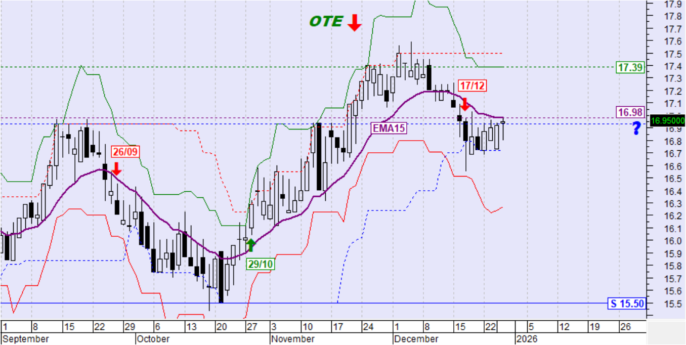 ο Εκθετικός Μέσος Όρος των 15 ημερών (ΕΜΑ15) στα 16.98€