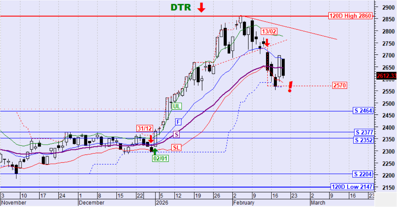 Ο δείκτης τραπεζών (ΔΤΡ) κινήθηκε καθοδικά και διατηρεί την τιμή χαμηλότερα των UL,F και S με αποτέλεσμα τη διατήρηση της καθοδικής τάσης. Μετά την εμφάνιση της αναμενόμενης ανοδικής αντίδρασης ο δείκτης γύρισε καθοδικά. Σε περίπτωση διάσπασης των 2570 μονάδων είναι πολύ πιθανό να αναζητηθεί στήριξη στην πρώτη στήριξη στις 2464 μονάδες.