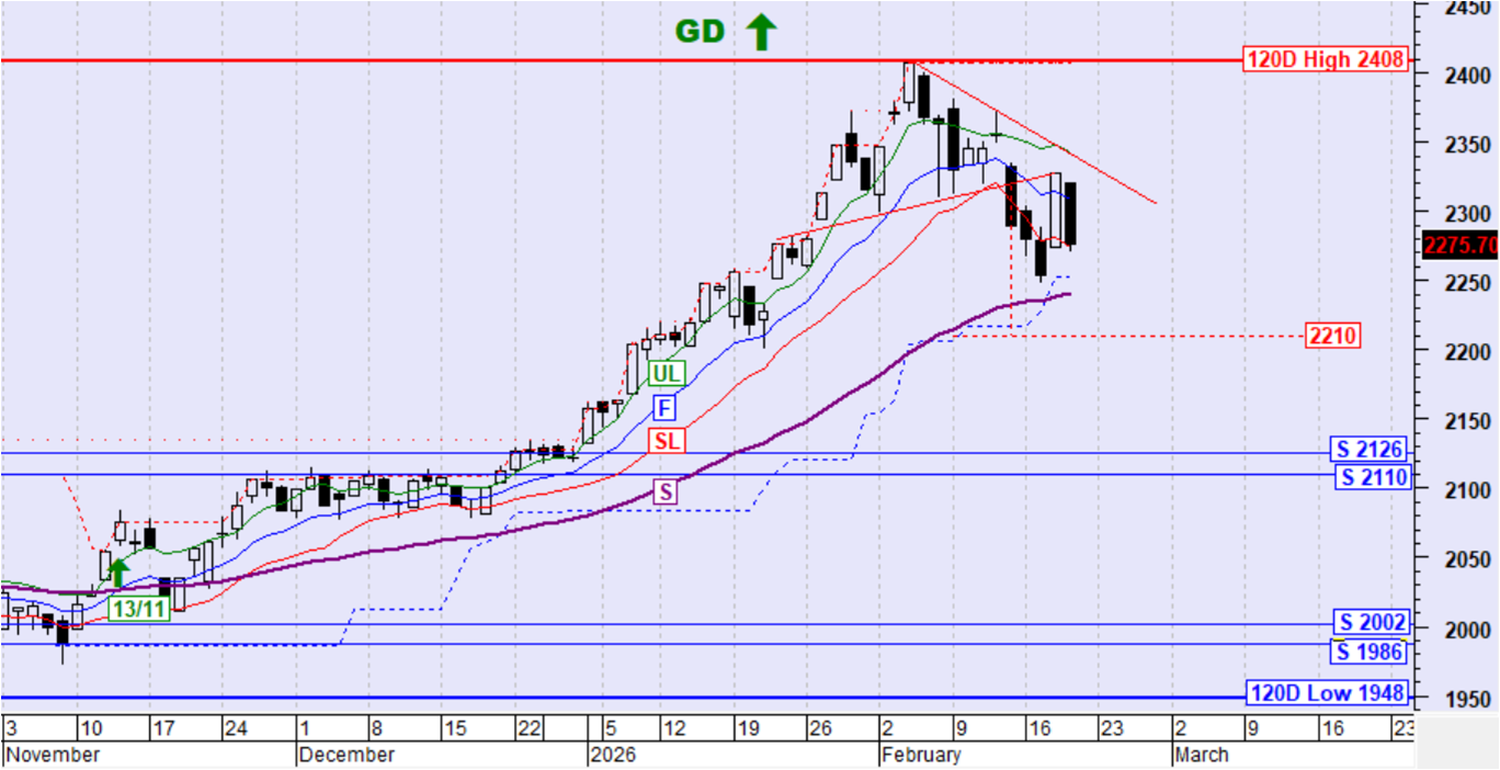 Ο ΓΔ κινήθηκε διορθωτικά και πέτυχε την καθοδική διάσπαση της SL. Η τιμή παραμένει ψηλότερα της του αργού κινητού μέσου όρου S έτσι διατηρείται η ανοδική τάση. Παραμένει ενεργός ο τοπικός σχηματισμός ΩΚΩ που έχει καθοδικό στόχο στην περιοχή των 2210 μονάδων.