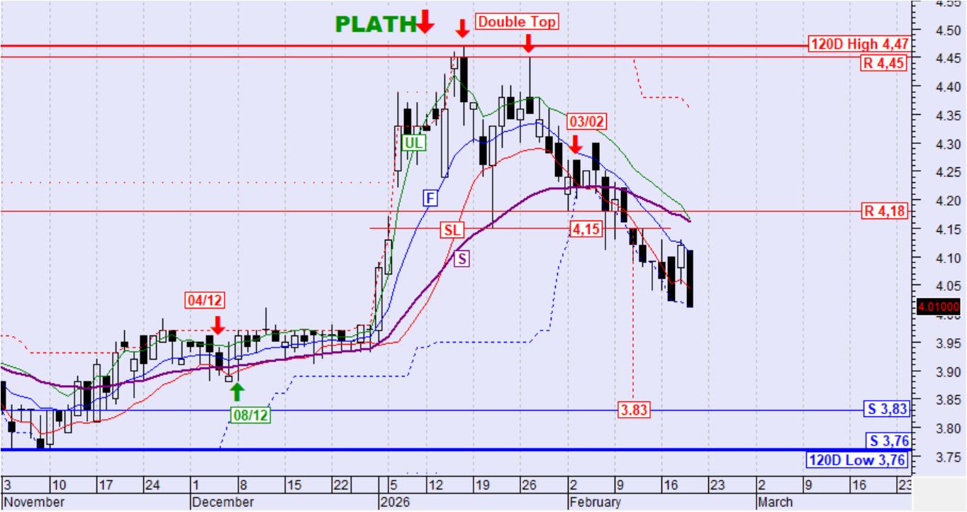 Η μετοχή κινήθηκε καθοδικά και διατηρεί την τιμή χαμηλότερα των UL,F,SL και S με αποτέλεσμα τη διατήρηση της καθοδικής τάσης. Παραμένει ενεργός ο σχηματισμός διπλής κορυφής όπως και ο καθοδικός στόχος στα 3,83€.