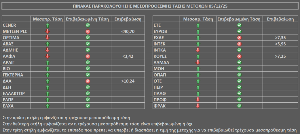 Η μεσοπρόθεσμη τάση των μετοχών του καλαθιού παρακολούθησης στο άνοιγμα της ερχόμενης εβδομάδας (διαμόρφωση με το κλείσιμο της Παρασκευής 05/12) είναι όπως στον παρακάτω πίνακα: