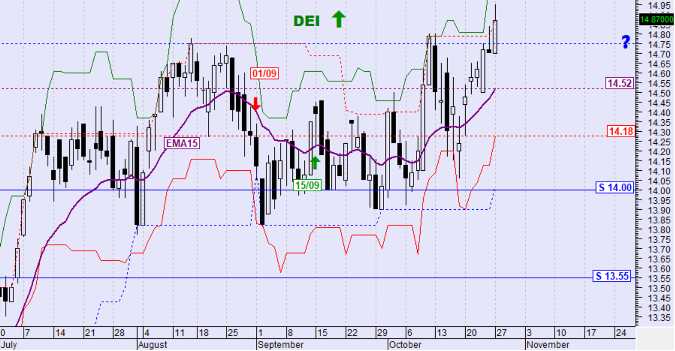 ο Εκθετικός Μέσος Όρος των 15 ημερών (ΕΜΑ15) στα 14,52€