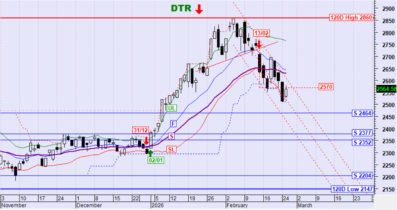 Ο δείκτης τραπεζών (ΔΤΡ) κινήθηκε ανοδικά αλλά παραμένει χαμηλότερα των UL,F και S με αποτέλεσμα τη διατήρηση της καθοδικής τάσης. Η διακύμανση της τιμής περιορίζεται εντός ενός πλαγιοκαθοδικού καναλιού ενώ η διάσπαση των 2570 μονάδων άνοιξε το δρόμο προς την πρώτη στήριξη στις 2464 μονάδες.