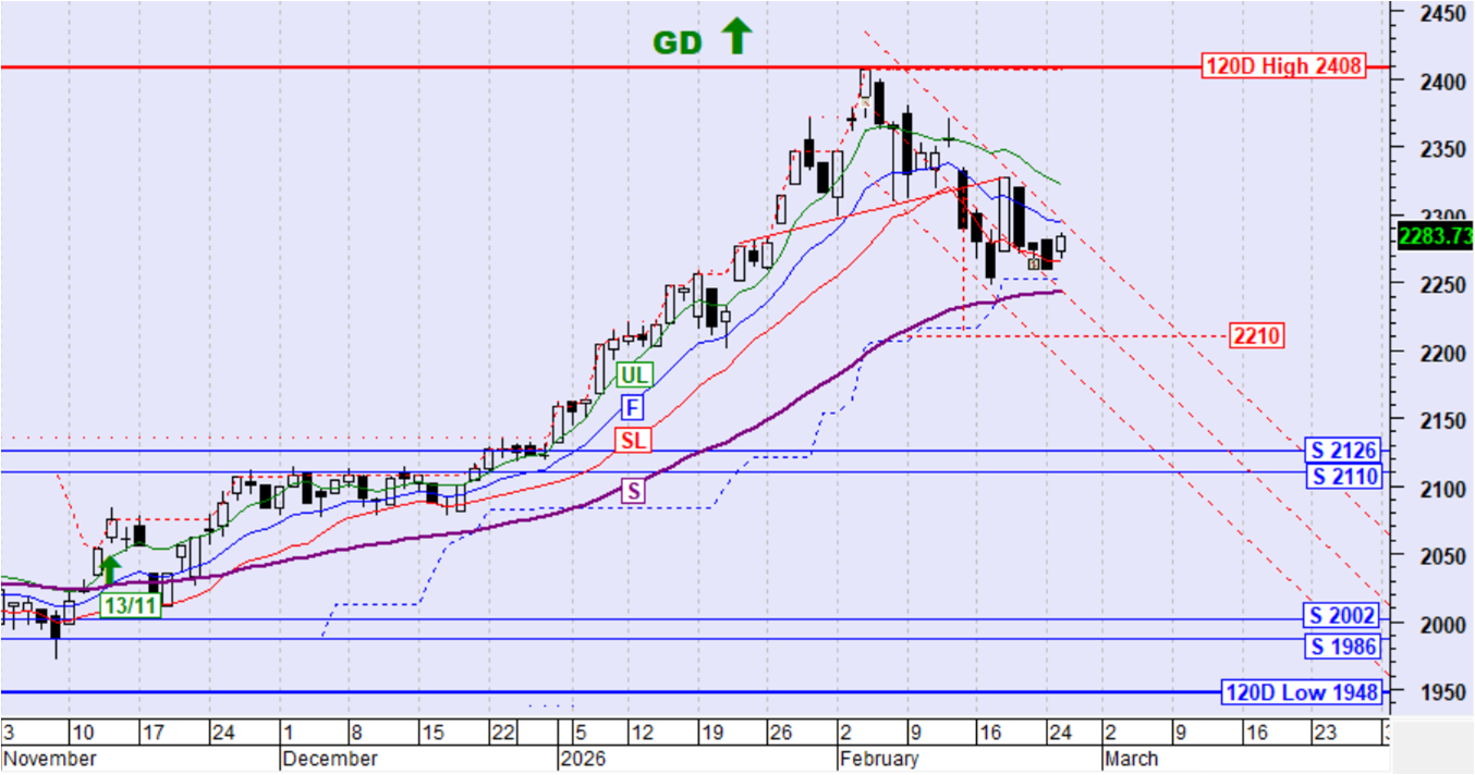 Ο ΓΔ κινήθηκε ανοδικά χωρίς σηματοδότηση. Η τιμή παραμένει ψηλότερα της SL και του αργού κινητού μέσου όρου S έτσι διατηρείται η ανοδική τάση ενώ η τιμή συνεχίζει την κίνησή της εντός ενός πλαγιοκαθοδικού καναλιού. Παραμένει ενεργός ο τοπικός σχηματισμός ΩΚΩ που έχει καθοδικό στόχο στην περιοχή των 2210 μονάδων