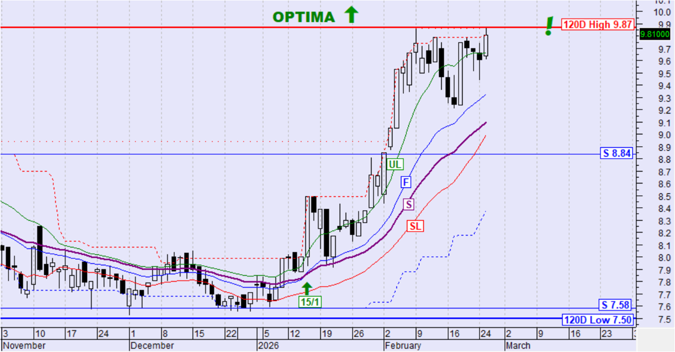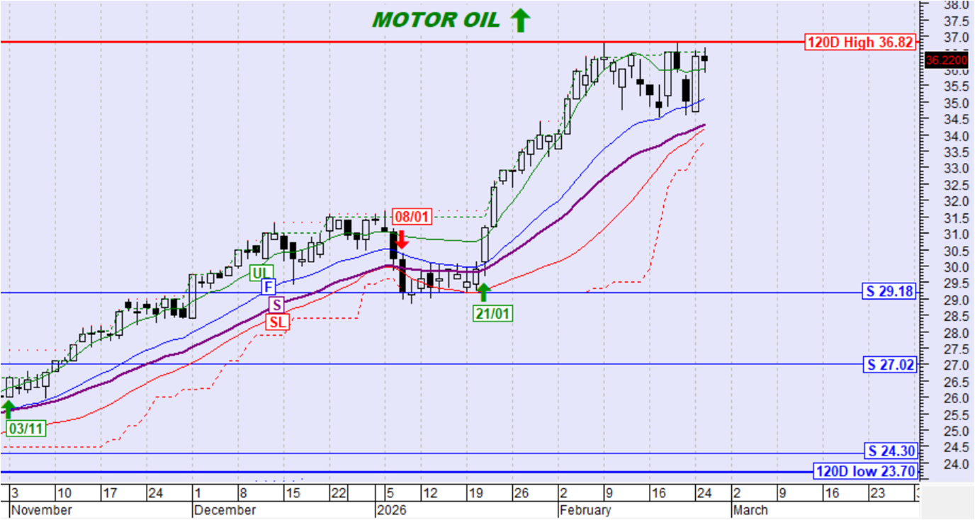 Η μετοχή κινήθηκε ανοδικά και πέτυχε νέο υψηλό 120 ημερών. Η τιμή παραμένει ψηλότερα της SL και του αργού κινητού μέσου όρου S έτσι διατηρείται η ανοδική τάση.