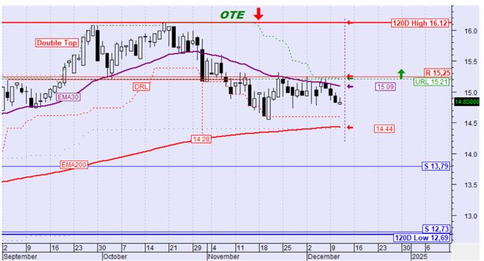 Στηρίξεις που ωθούν/μπορούν να ωθήσουν την τιμή ανοδικά: η μεσοπρόθεσμη στήριξη στα 15,59€, ο Εκθετικός Μέσος Όρος των 30 ημερών (ΕΜΑ30) στα 15,49€, η μεσοπρόθεσμη στήριξη στα 14,99€, ο Εκθετικός Μέσος Όρος των 200 ημερών (ΕΜΑ200) στα 14,98€ και το όριο αλλαγής της τάσης στα 14,85€